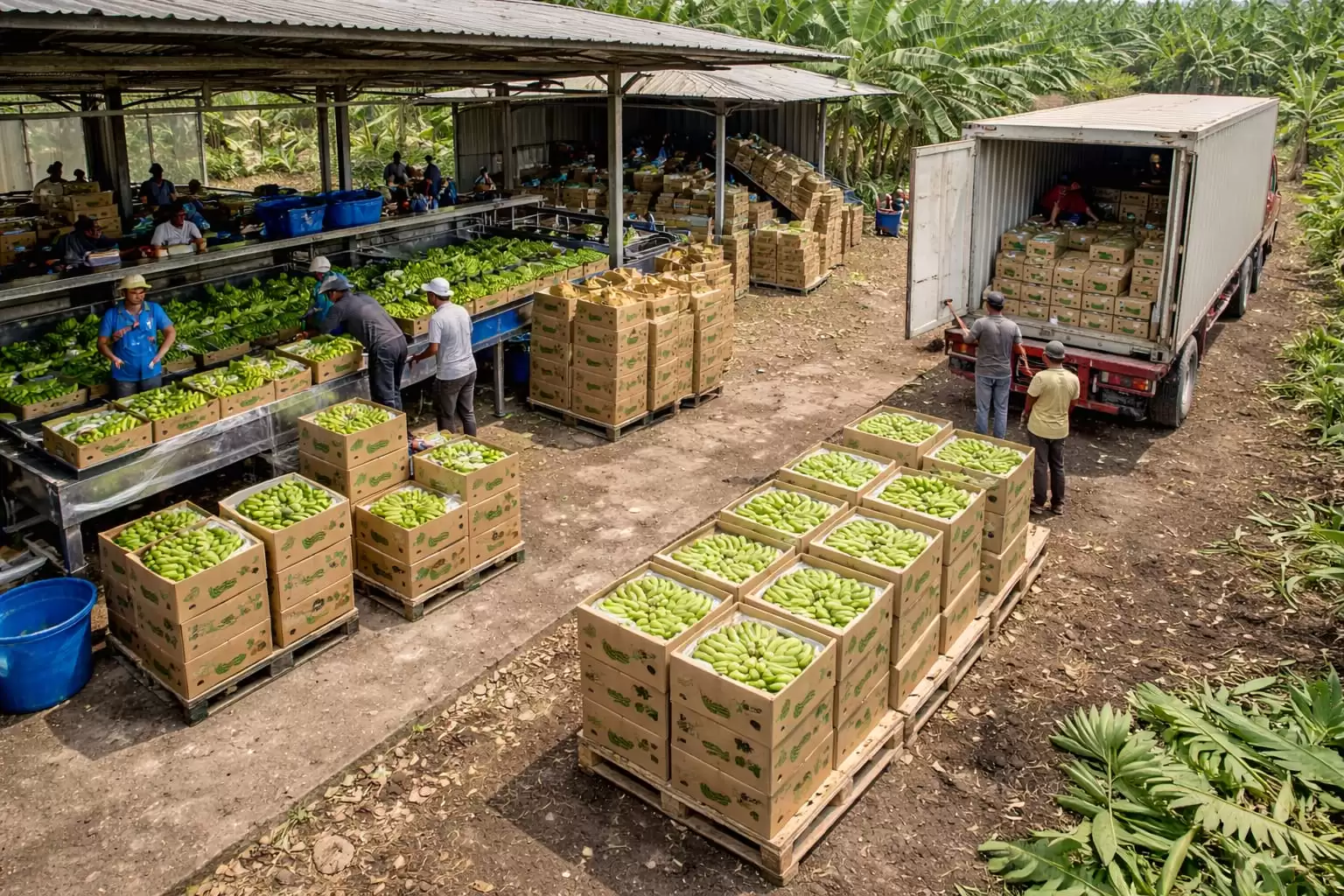 Hasat sonrası ürünler kontrollü atmosferli konteynerlere alınarak Türkiye’ye doğru sevk edilir. AKR Tropikal haftalık 40–50 konteyner arası sevkiyat planlaması yapar.