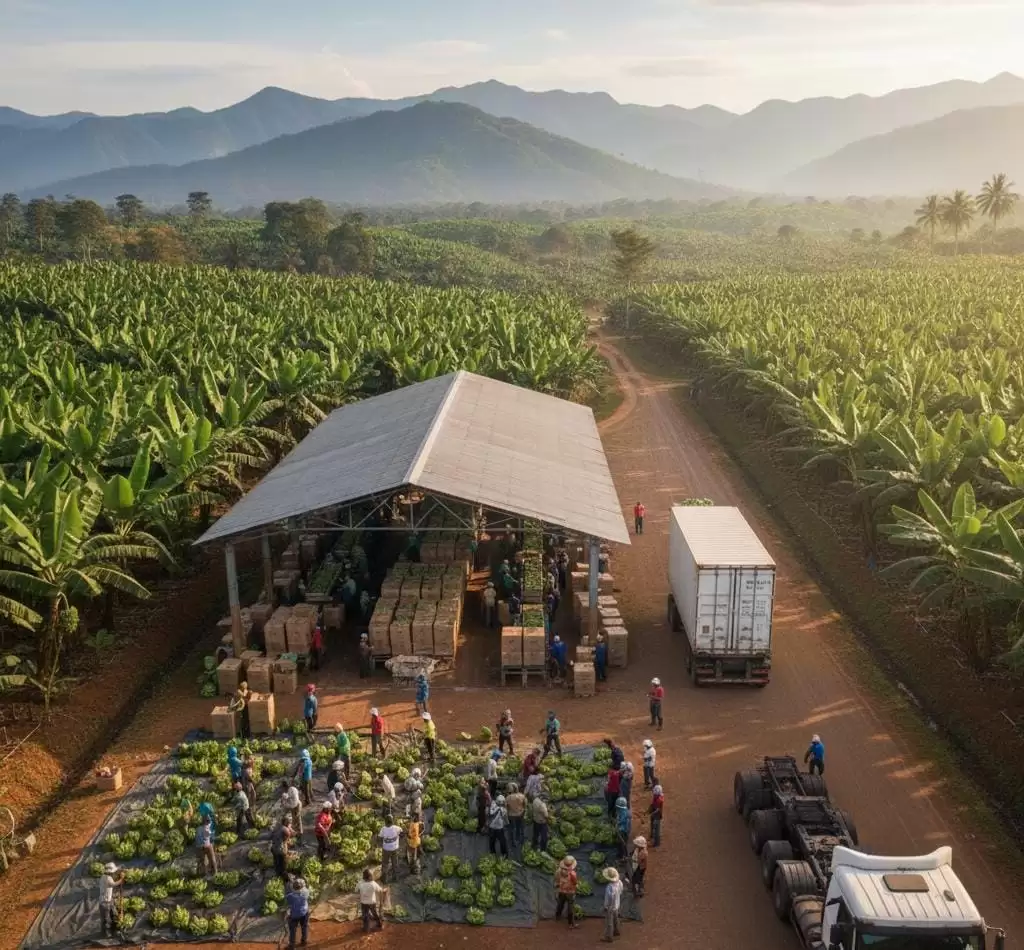 Muzun yolculuğu, Güney Amerika’daki açık alan plantasyonlardan başlar. Doğal iklim koşullarında büyüyen ürünler hasat dönemine göre kesilir, ardından soğuk zincir konteynerlerle Türkiye’ye sevk edilir. Ürün burada işlenir, sınıflandırılır, olgunlaştırılır ve lojistik sevkiyat ağı üzerinden marketlere yönlendirilir.