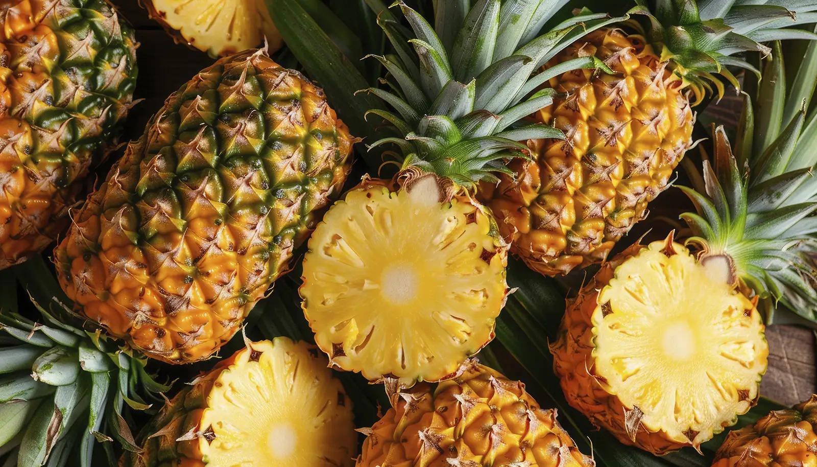 Ananas, C vitamini, manganez ve bromelain enzimi açısından zengindir. Sindirim sistemini destekleyen, bağışıklığı güçlendiren ve ferahlatıcı etkisiyle bilinen bu meyve, taze tüketimin yanı sıra meyve suları, smoothieler, tatlılar ve gastronomik uygulamalarda geniş kullanım alanına sahiptir. Egzotik lezzeti ile mutfaklara tatlı ve sağlıklı bir dokunuş katar.